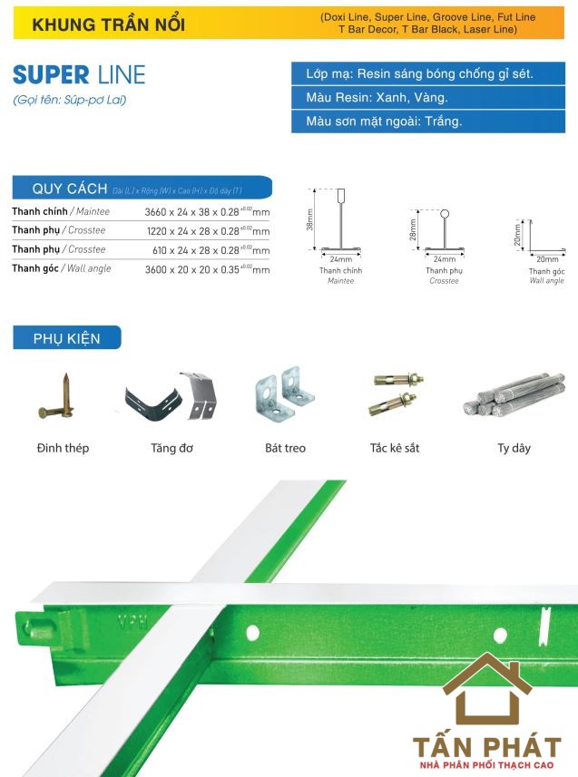 Khung trần nổi Super của Vạn Phát Hưng được sản xuất từ nguyên liệu thép mạ nhôm kẽm sáng bóng, chống rỉ sét. Đây là sản phẩm khung được rất nhiều thầu thợ và chủ công trình ưa chuộng bởi độ bền và đầu ngàm chắc chắn, dễ lắp đặt. Khung Super cũng là lựa chọn giúp tiết kiệm chi phí đầu tư mà vẫn đảm bảo được chất lượng cần có, phù hợp với nhà ở và cả các dự án lớn.